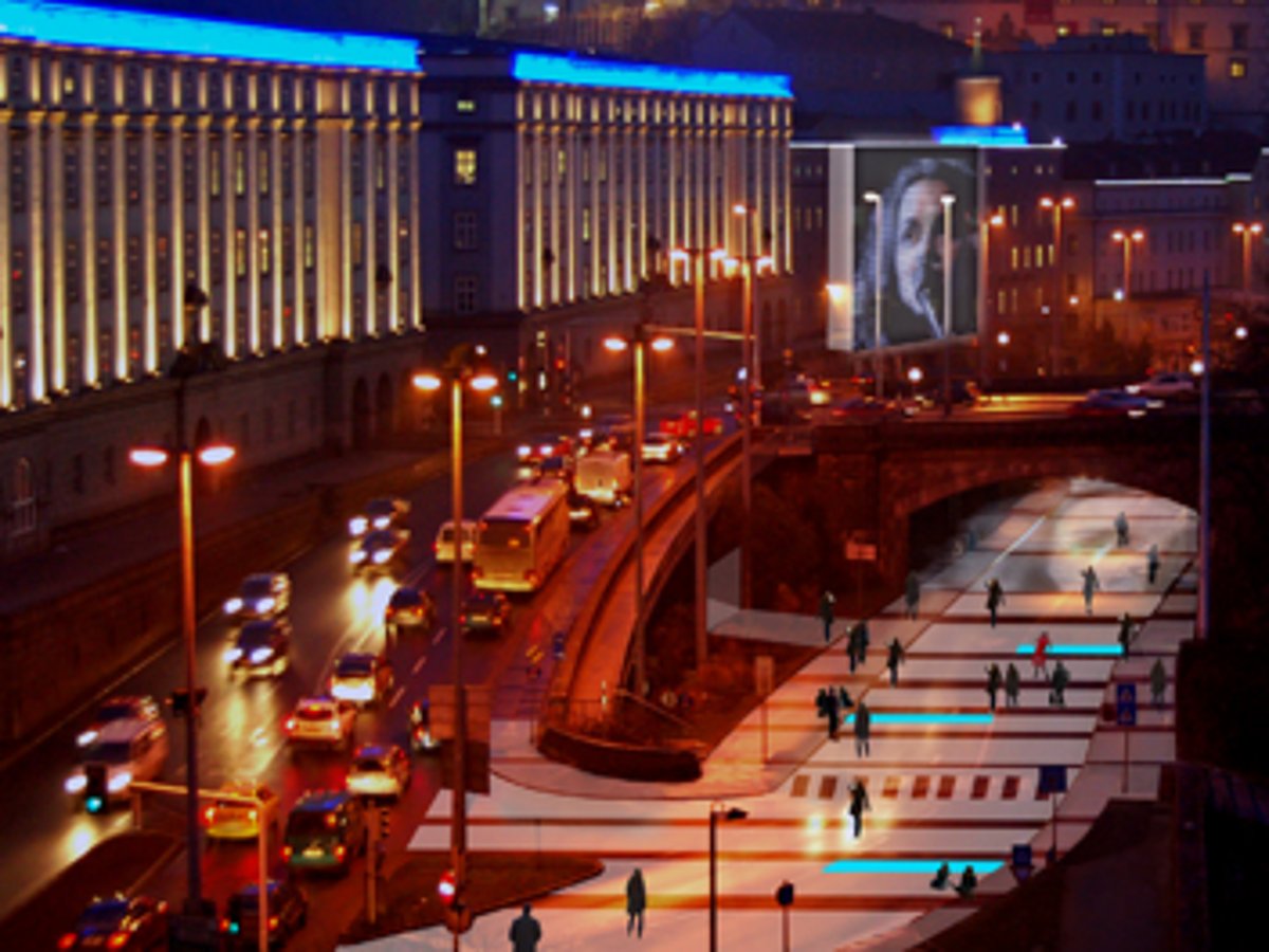 Das beidseitige Öffnen und Schließen durch zum Beispiel Videovorhänge definiert diesen Bereich als zentralen „Innenraum“. Die bestehende FußgängerInnenunterführung wird um einen Durchgang erweitert und verbindet so den Hauptplatz mit dem neuen Donaustreifen. Der Urban Screen zwischen Brückenkopfgebäude und Gleißnerhaus nützt zusätzliches Potential von „Leerräumen“ entlang der Stadtfront an der Donau und bereichert nächtens als leuchtende Werbefläche die Lichtskyline von Linz. Begleitend kann diese Intervention als städtische Informationswand zur Mitfinanzierung der „VORder.Stadt“ dienen. „VORder.Stadt“ bietet die Chance, ein verkanntes Potential des Straßenraumes zu begreifen, zu okkupieren und mit neuen Nutzungen zu überlagern. Durch die architektonische Vision wurde der Ort lesbar gemacht, seine Existenz zu Tage gefördert und benannt. Reclaim the streets!