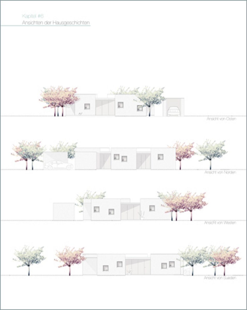 Jede Geschichte hat ihren Anfang. Der Anfang der Hausgeschichten liegt in der Struktur des Haufenhofes, wobei Gebäude so zueinander stehen, dass sie einen nicht geschlossenen Hof bilden. Dieses „Raumbilden“ wir weitergeführt, indem die einzelnen Räume eines Wohnhauses so zueinander wandern, dass sich der Wohnraum in die Mitte des Hauses platziert und so durch die intimen, bzw. funktionalen Räume strukturiert wird und sich unterschiedliche Zonen des Wohnens, bilden.