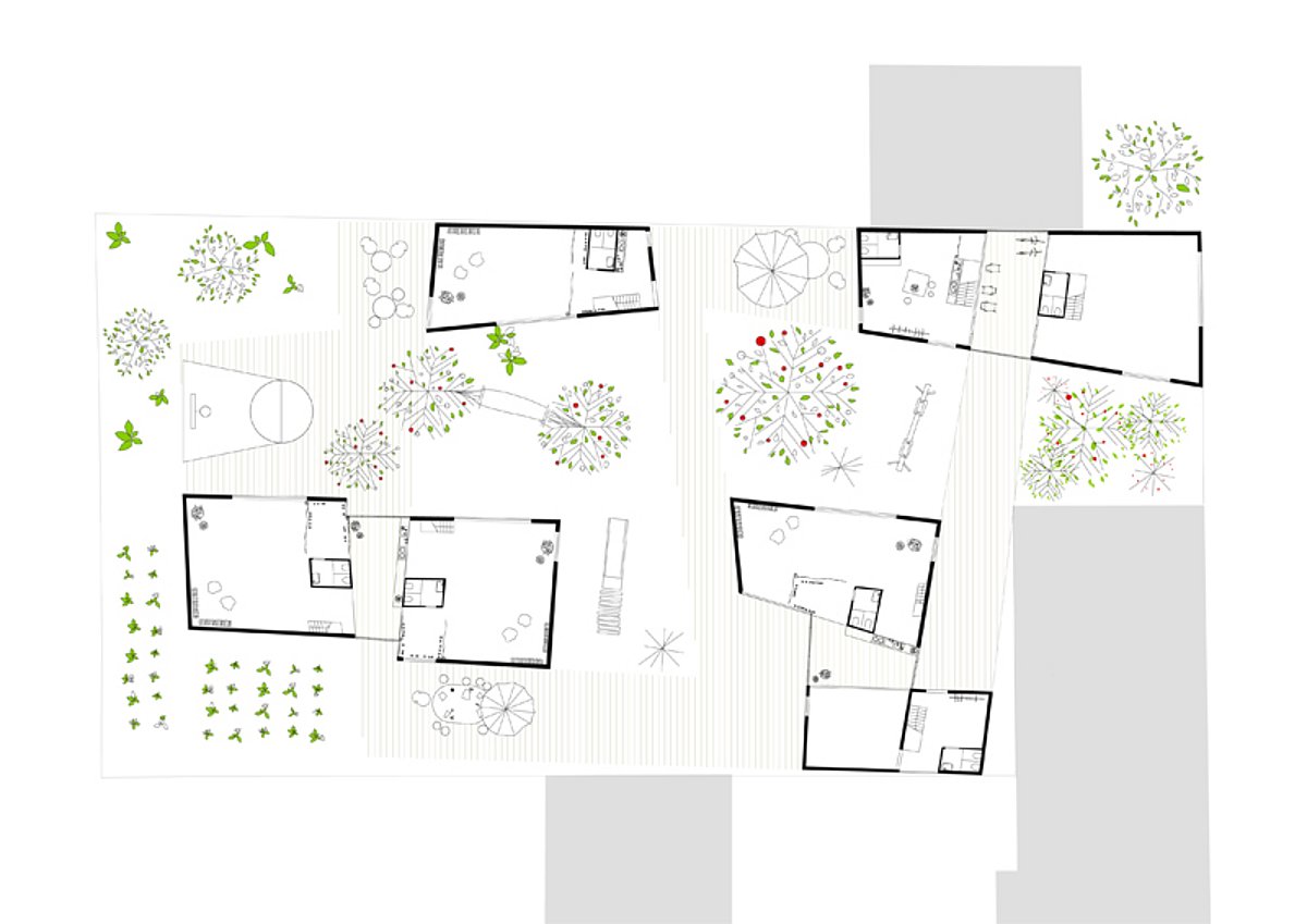 The functions of the kindergarten are spread over the building site, like the infrastructure of the city is spread all over the town. By making a reconstruction the regulations, to make one compact building are bypassed. This makes the connection between the small buildings very important. A huge terrace serves this purpose and structures the space.