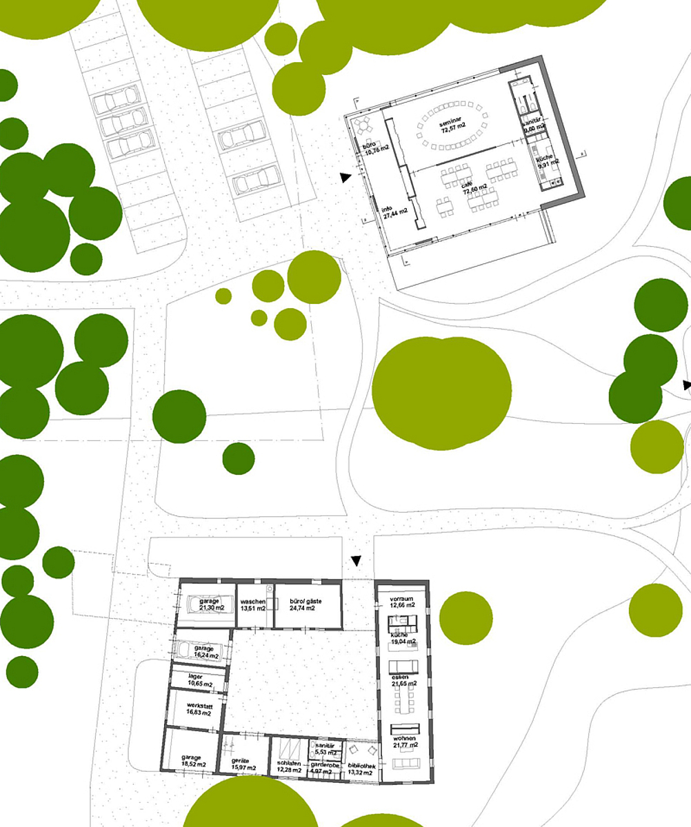 Das ‚Schließen‘ des Innenhofes im Seminarhaus (durch das Auffüllen mit den Funktionen Saal und Cafe) führt vom Atrium zur kompakten Schachtel. Damit entsteht eine energetisch optimierte Bauform. Das Haus verleiht durch seine Form dem Inhalt Ausdruck. Es ist ausschließlich aus massivem Holz (Bretter in Kreuzlage) gebaut und wird so ein Beitrag zum einfachen Bauen, das mit einer minimalen Anzahl an Details auskommt. Aus seiner konstruktiven Logik wird sowohl die Fassade als auch das Tragwerk entwickelt.