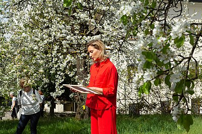 Smirna Kulenović präsentierte im Rahmen des Artist in Residence-Programms des Projektes Plateau Blo und der Abteilung Raum-und Designstrategien – ihre künstlerische Arbeit: OUR FAMILY GARDEN, welches als transdisziplinäres Kunstprojekts, die Rolle von Frauen bei der Bewahrung kollektiver Erinnerungen betont und sich mit der Wiederherstellung von Grenzlandschaften in Bosnien und Herzegowina nach dem Krieg befasst. Im Jahr 2021 versammelte die Künstlerin Smirna Kulenović 100 Frauen zu einem kollektiven, ortsbezogenen Ritual in Bosnien und Herzegowina und bepflanzte ehemalige Schützengräben mit über 1000 Ringelblumen. In ihren transformativen Arbeiten mit Heilpflanzen verschränkt sie diesen Ort ihrer Heimat mit dem Klostergarten in Gmunden. Viele Besucher*innen nahmen die von der Künstlerin und Kuratorin geführten Spaziergänge in Anspruch und nutzten die Möglichkeit ins Gespräch zu kommen.