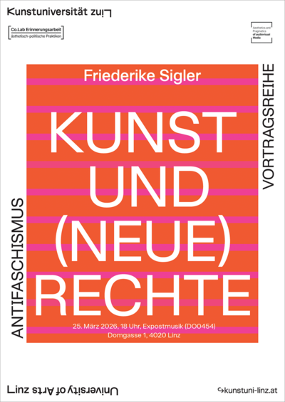 Das Co.lab Erinnerungsarbeit·ästhetisch-politische Praktiken und die Abteilung für Ästhetik und Pragmatik audiovisueller Medien lädt zum Vortrag Kunst und (Neue) Rechte von Friederike Sigler ein. Der Vortrag findet im Rahmen der Reihe Antifaschismus statt.