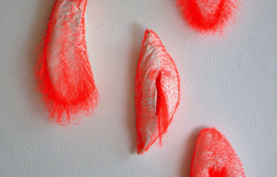 In der Ausstellung erscheinen die Werke als Tondi – tafelbildartig an der Wand – oder als Objekte an der Wand. Aus den Gipskörpern ragen feine Schlaufen aus Nähseide hervor, manchmal zeichnen Nähte die Kontur oder bestimmen die Form der Objekte.
