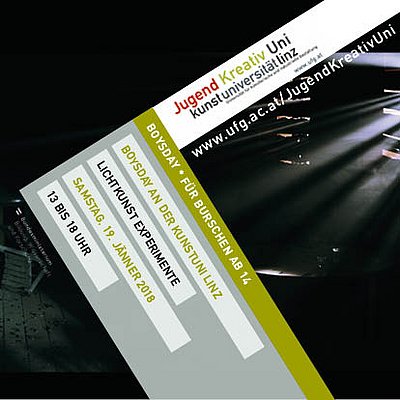 Am 19. Jänner 2019 können Burschen/Jugendliche ab 13 Jahren* in der JugendKreativUni der Kunstuniversität Linz mit Licht künstlerisch und experimentell spielen und die eigene Kreativität ausleben. Zu dieser Veranstaltung laden wir herzlich ein!