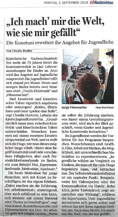 Bericht in den OÖ Nachrichten über die JugendKreativUni, das neue Angebot der Kunstuniversität Linz