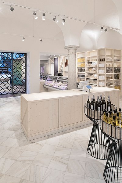Die Räumlichkeiten aus dem frühen 18. Jahrhundert mit Granitsäulen und Gewölbe wurde in der Anmutung einer Greißlerei mit Marktplatz-Situation interpretiert.