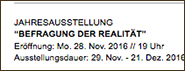 Im Rahmen der Ausstellung Die Befragung der Realität setzten sich die Mitglieder der Vereinigung Kunstschaffender OÖ intensiv mit unterschiedlichsten Themenfeldern des Realitätsbegriffs auseinander. Die Ausstellung umfasst ein breites Spektrum an teils speziell für diese Ausstellung erarbeiteten künstlerischen Positionen welche die Kuratorinnen Antonia Riederer und Marie Ruprecht-Wimmer in Kooperation mit Heinz J. Angerlehner (Museum Angerlehner) zu einer Schau vereinen. Die Realität ist nicht schwarz-weiß und doch schafft die farbliche Klammer, die Auswahl von Arbeiten in schwarz, weiß und grau, dieser Ausstellung eine gemeinsame Realität, einen kleinen gemeinsamen Nenner aller Positionen. Als Realität wird im allgemeinen Sprachgebrauch die Gesamtheit des Realen bezeichnet. Trotz genauestem Definitionsversuch ist der Realitätsbegriff ein weiter und immer auch vom sozialen Kontext abhängig. Des einen Realität ist oft nicht die Realität des Anderen. Realität ist zunächst für uns das, was wir wahrnehmen. Erstaunlich ist, wie verschiedene Menschen eine für sie ähnliche Welt doch sehr unterschiedlich interpretieren. In welchem Umfang präsentiert uns unser Gehirn die Welt wie sie wirklich ist? Inwieweit weicht das Innenbild vom Außenbild ab? Infolge ihrer beschränkten Aufnahmekapazität liefern uns unsere fünf Sinne immer nur einen kleinen Teil der vermeintlichen Realität. Unsere Wahrnehmungssysteme sind - bestätigt der Neurobiologe Wolf Singer, Direktor des Max-Planck Instituts für Hirnforschung - in hohem Maße interpretativ. Als Menschen könnten wir nie die Realität an sich, immer nur die subjektive Wahrnehmung erkennen. „Realität ist das, was wir hier im Augenblick wahrnehmen und worauf sich die meisten die dies wahrnehmen geeinigt haben“ Der Realitätsbegriff im Kunstkontext versteht in erster Linie jene Wirklichkeiten, die mit unterschiedlichsten künstlerischen Verfahren dargestellt werden, beeinflusst durch die momentane Situation in der sich der Künstler während des Schaffensprozesses befindet. Über den persönlichen und kulturellen Hintergrund wird die Realität des Künstlers gebildet. Durch das Bewusstsein und die momentane Wahrnehmung entsteht Realität im Hinblick auf die künstlerische Arbeit.