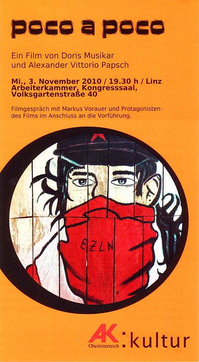 Der Dokumentarfilm „poco a poco“ (dt.: nach und nach) begleitet MenschenrechtsbeobachterInnen auf ihrem Weg in zapatistische Gemeinden in Chiapas (Mexiko) und zeigt ihre Aufgaben, Erlebnisse und Schwierigkeiten während ihres dortigen Aufenthalts. Durch die Menschen vor Ort erfahren wir mehr über die zapatistische Bewegung und deren Kampf, aber auch über die Menschenrechtsbeobachtung selbst und den Konflikt in Chiapas. Dieser seit Jahrhunderten bestehende Konflikt zwischen indigener und nicht-indigener Bevölkerung verstärkt sich noch durch kapitalistisches Denken, welches keine Rücksicht auf Menschlichkeit nimmt.