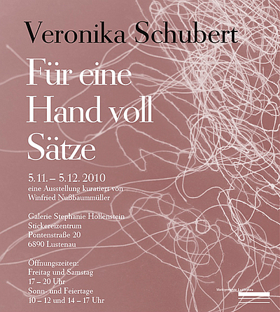 Die Ausstellung der in Lustenau aufgewachsenen Künstlerin Veronika Schubert verspricht einen faszinierenden Grenzgang zwischen Trickfilm und Tradition. Grundlage ihrer Auseinandersetzung ist die Frage nach dem persönlichen Umgang mit Geschichte und sprachlicher Identität. Schwerpunkte der künstlerischen Arbeit sind die vielseitige Verwendung von Text und gesprochener Sprache. Die für die neue Trickfilmarbeit „Säg gaad“ (2010) verwendeten, handschriftlich aufgezeichneten Lustenauer Dialektwörter – wie hei ou, hô hei, hô-hô, inn, oha oder botz – entwickeln ein beeindruckendes mediales Eigenleben. Hunderte Einzelbilder gestickter Umrisslinien überlagern sich in kanonartig wiederholten Sequenzen vor dem Auge des Betrachters permanent zu einem neuen, sich dann wiederum auflösenden Bild. Gerade vor dem Hintergrund der eigenen Herkunft verdeutlicht Schuberts so leichtfüßig wirkendes Video die Komplexität einer Konstruktion von Persönlichkeit.