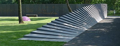 Zwei skulpturale Hauptelemente strukturieren das Gelände der Gedenkstätte. Durch eine im Grundriss L-förmige Mauer aus anthrazit gefärbten Betonelementen die den Gedenkort von der Straße abschirmt, stellen struber_gruber eine neue Annäherungssituation her. Durch das kontinuierliche Neigen der Betonelemente an der Längsseite öffnet sich den Hereingehenden der Blick in die Gedenkstätte langsam.