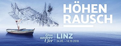 HÖHENRAUSCH - Das andere Ufer Das Wasser steht im Mittelpunkt des Höhenrausch 2018. Gestaltlos, schwankend und flüssig ist das Wasser für die Festländer seit jeher ein fremder Raum gewesen. Faszinierend und unbegreiflich in seiner abstrakten Schönheit, aber auch voller Unergründlichkeiten unter einer scheinbar „glatten“ Oberfläche. Unendlich entgrenzt, lebensspendend, eigentlich niemandes Eigentum und eigenen Gesetzen folgend, gleichzeitig ein bedrohlicher Schwellenraum und eine kaum zu überwindende Grenze, „barbarisch“ befremdlich und verheerend. Mehr als 40 internationale künstlerische Beiträge zeigen, wie widersprüchlich das „Element Wasser“ für uns sein kann: ein Raum des Scheiterns, des Aufbruchs, des Austausches, der Überwindung und der Utopie. Der Orientierungspunkt ist dabei immer das andere Ufer, manchmal leicht zu erreichen, manchmal hinter dem Horizont in unendliche Ferne gerückt. Der Höhenrausch-Parcours mit seinen Wegen, Brücken und Treppen, den verschiedenen Kunsträumen, Dachböden und der weiten Dachlandschaft über Linz bildet für dieses aussergewöhnliche Kunstprojekt die atmosphärisch aufgeladene Rahmung.