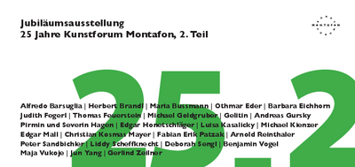 KünstlerInnen: Alfredo Barsuglia, Herbert Brandl, Maria Bussmann, Othmar Eder, Barbara Eichhorn, Judith Fegerl, Thomas Feuerstein, Michael Goldgruber, Gelitin, Andreas Gursky, Pirmin und Severin Hagen, Edgar Honetschläger, Luisa Kasalicky, Michael Kienzer, Edgar Mall, Christian Kosmas Mayer, Fabian Erik Patzak, Arnold Reinthaler, Peter Sandbichler, Liddy Scheffknecht, Deborah Sengl, Benjamin Vogel, Maja Vukoje, Jun Yang, Gerlind Zeilner