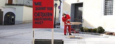 Die Arbeiten von Veronika Platz sind Ergebnisse einer dreimonatigen künstlerischen Auseinandersetzung mit dem Ort Helfenberg, seinen Menschen und aktuellenräumlichen Situationen. Wo ist der Ortskern und was soll mit dem Ortskern passieren? Mit unterschiedlichen Aktionen hat sich die Künstlerin auf die Suche nach spannendenAntworten gemacht und stieß nicht nur auf ortspezifische Themen und räumliche Besonderheiten.