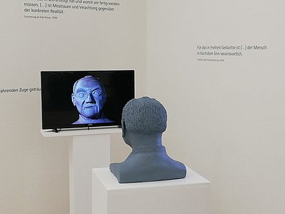 Die zweiteilige Installation besteht aus einer gebrannten Ton-Büste von Ernst Krenek, die in ein animiertes Spiegelbild auf einem Monitor blickt. Im Film zu hören sind die Witwe Ernst Kreneks, Gladys N. Krenek, und der Komponist selbst. Die ausgewählten Textpassagen sollen die Betrachter/innen zum Nachdenken über philosophisch-existentielle Fragen anregen.