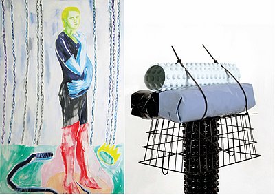 l: T. U. CELLNIGG “Herrscherin 4“ 2020, Öl/ LW, 170 x 110 cm r: J. GATTERMAYR “Game and Performance“ 2021, div. Materialien, 136 x 42,5 x 29 cm