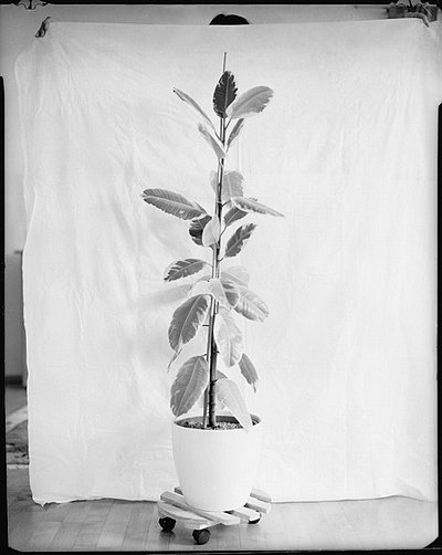 Für das Projekt „botanica“ bittet die Fotokünstlerin ihren Freundes- und Bekanntenkreis vor die Kamera. Jede/r hält ein weißes Tuch und präsentiert davor eine Zimmerpflanze aus seiner/ihrer Wohnung. Die Ergebnisse nennt sie erweiterte Portraits, denn die Pflanze lasse in gewisser Weise Rückschlüsse auf die Person zu.