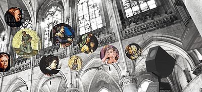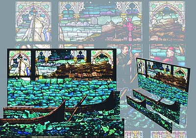 Zoe Goldstein übersetzt mit /DIE DARSTELLERIN/ fotografisch und in Form eines Modells die historische Glasfenster-Darstellung "Pilgerfahrt II" in die Gegenwart mit neu verteilten Rollen und inszeniert eine objektbezogene inhaltliche Metamorphose von Sichtweisen.