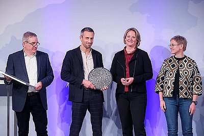 Sieger Kategorie Wertvolle Substanz: Gunar Wilhelm von mia2 Architekten (2.v.l.), Juroren Georg Wilbertz und Stefanie Murero, OÖN-Chefredakteurin Susanne Dickstein (2.v.r.) Bild: (Weihbold)