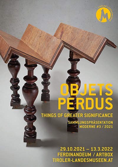 „Objets Perdus“ bedeutet so viel wie „verlorene Gegenstände“. Bei der Bezeichnung handelt es sich um eine Umformulierung des seit Beginn des 20. Jahrhunderts etablierten Begriffs „Objets Trouvés“. Dieser beschreibt „gefundene Gegenstände“, die zu Kunstwerken oder Teilen davon erklärt werden. Vor diesem Hintergrund beschäftigt sich auch die Sammlungspräsentation der Moderne mit Werken, die seit den 1990er Jahren aus einer Auseinandersetzung mit gefundenen Gegenständen oder Materialien entstanden sind. Bei den ausgestellten Arbeiten sind das alltägliche Material sowie die zahlreichen Assoziationen, die man damit verbinden kann von Bedeutung. Gegenständen, die auf den ersten Blick gewöhnlich erscheinen mögen, wird ein tieferer, immaterieller Sinn zugeschrieben. Im Zuge dieser Verwandlung in ein Kunstwerk gehen die Gegenstände aber auch als solche verloren, während ein neues künstlerisches, philosophisches oder soziologisches Potenzial ihrer Materialität freigelegt wird.  KURATORIN  Mag.a. Rosanna Dematté