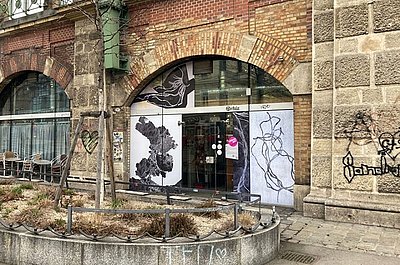 Inga Hehn und Hanna Hollmann bespielen die Fassade des Rhiz Lokals in der Josefstädterstrasse in Wien. Ab sofort ist eine Auswahl an Arbeiten für die nächsten 3 Monate jederzeit öffentlich zu sehen.