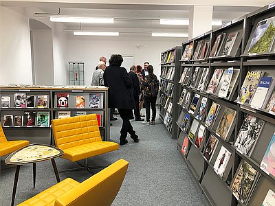 Manfred Lechner, Bibliotheksdirektor, führt uns durch die neuen Räume sowie die Sesselsammlung und gibt einen Überblick über das breite Angebot der Bibliothek.