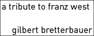 Die Symmetrien stimmen allemal – sich in einer exemplarischen Künstlerfigur, wie Franz West gespiegelt zu haben, mochte den einzelnen TeilnehmerInnen der Ausstellung zumindest eines gebracht haben: Für diesen „westischen“ Augenblick ihrer Künstlerkarriere gegenwärtig gewesen zu sein. Noch in fühlbaren Abstand zu seinem Ableben mag die Ausstellung „a tribute to Franz West“ in der Galerie Konzett ein höchst relevantes Pendant zur großen Westausstellung „Franz West: Wo ist mein Achter?“, vom 23. Februar - 26. Mai 2013, im MuMok, Wien, sein.
