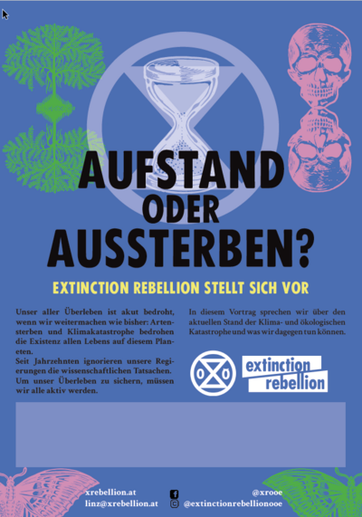 Die Umweltschutzbewegung Extinction Rebellion wird einen Informationsabend bieten, über Themen der Klimakrise, das Massenaussterben und was wir dagegen tun können.