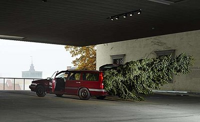 Ein Auto, am Rande der Straße geparkt, die Fahrertür offen, der Fahrer hat das Auto offenbar gerade für einen „Boxenstopp“ verlassen; aus dem Kofferraum des Autos ragt ein absurd riesiger Christbaum weit in den Raum: Dieses humorvoll-narrative Szenario steht exemplarisch für die verschiedenen traditionellen Rituale und Aktivitäten rund um das Weihnachtsfest, die wir Jahr für Jahr ausführen, ohne uns je Gedanken über ihren Ursprung und ihre Bedeutung zu machen.