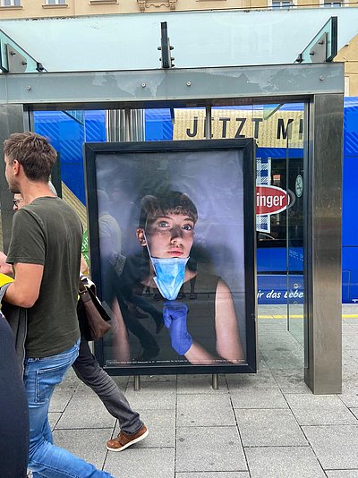 Studierende des ersten Semesters des Studiengangs BA – Kulturwissenschaften meldeten sich für die Lehrveranstaltung Fotografie bei Paul Kranzler an. Es wurden Termine im Fotolabor und dem Fotostudio avisiert. Die analogen Grundlagen der Fotografie sollen von den Studierenden erstmals kennengelernt werden. Im Fotostudio sollte mit der Großformatkamera und Polaroid – Filmmaterial gearbeitet werden. Am Ende des Semesters nimmt man sich vor eine kleine Ausstellung zu organisieren. Dann kam der Shutdown bevor eine einzige Lehrveranstaltung abgehalten werden konnte, und die Studenten steckten zuhause fest. Gemeinsame Termine im Fotolabor und Fotostudio waren nicht mehr möglich. Die Universität wurde weitgehend geschlossen, bundesweit wurden Ausgangsbeschränkungen verhängt. Die Studierenden arbeiteten sich in diesen Wochen des Rückzugs ins Private am Thema Selbstportrait regelrecht ab. Technische Hürden mussten so gut es ging via Videokonferenzen überwunden und künstlerische Entscheidungen ebenso auf diesem Weg besprochen werden. In den gemeinsamen online Gesprächen der Gruppe wurde auch beobachtet wie enorm sensibel das Wirtschaftssystem reagierte. Als einer der ersten reagierte der Werbemarkt insofern, dass weniger Werbung geschaltet wurde, weniger Werbeplakate im öffentlichen Raum angebracht wurden.