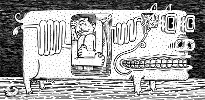 Im Alltag stolpert Elias Takacs oft über Situationen, die aus einem Kabarettprogramm stammen könnten. Diese sind nicht selten der Ursprung seiner Malereien und Zeichnungen. Die Protagonisten sind oftmals verzerrte menschliche Wesen, in denen sich der Wahnsinn, der in ihnen wohnt und sie umgibt, widerspiegelt.