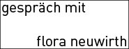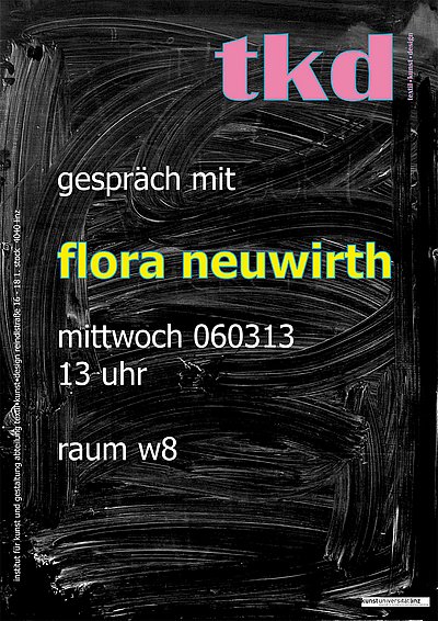 "Die Kontinuität von Flora Neuwirths Arbeitsweise zeigt sich in der wiederholten Aneignung von bereits Vorhandenem. Sie verwendet Elemente aus Kunst, Design, Architektur, Alltag, adaptiert beziehungsweise rekombiniert sie und verallgemeinert ihre überlieferten Werte - die Grenzen zwischen High und Low werden aufgehoben. Ihre intermedialen Arbeiten sind durch das Einnehmen von verschiedenen Rollen und Funktionen gekennzeichnet - von der Künstlerin, Designerin, Performerin bis zur Kuratorin, Köchin oder Barfrau - und regen zu einer Auseinandersetzung über gestaltete Lebensbereiche an."