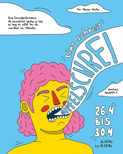 Auf der Dachterrasse des Kunstunigebäudes am Hauptplatz 6 ist jeder Person einzeln erlaubt, die Grenzen des eigenen Sprachorgans auszutesten. Nur Worte sind tabu. Über ein Mikrofon wird aufgezeichnet und der Zusammenschnitt der einzelnen wird zu einem gemeinsamen Schrei. Von Johannes Herzmaier produziert, wird dieser am Ende der Woche mit großen Lautsprechern den Hauptplatz beschallen.