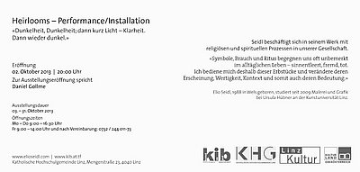 Eröffnung: 2. Okt. 2013, 20 Uhr; Ausstellung bis 31. Okt. 2013 Katholische Hochschulgemeinde Linz, Mengerstraße 23, 4040 Linz