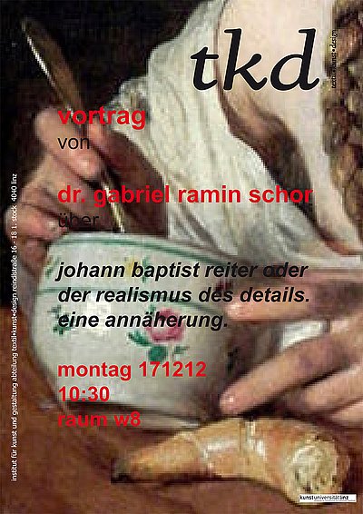 Das Werk des oberösterreichischen Porträt- und Genremalers Johann Baptist Reiter (geb. 1813 in Urfahr/Linz - gest. 1890 in Wien) gehört allgemeinem Konsens nach eher zur Peripherie des größeren kunstgeschichtlichen Entwicklungszusammenhangs im 19. Jahrhundert, den man nach Courbet Realismus nennt. Diese Einordnung wird dem Schaffen Reiters jedoch nur dann entsprechend gerecht, wenn und solange man das subtil inszenierte Eigenleben vieler seiner Bilddetails außer Acht läßt, d. h. ein Detail der konventionell übergeordneten Bildtotalität unterordnet.