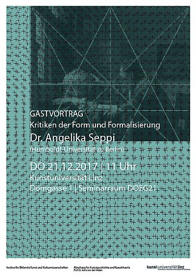 In ihrem Vortrag stellt Dr. Angelika Seppi (Kunstgeschichte, HU-Berlin) ihr gegenwärtiges Forschungsvorhaben dar, das sich aus milieutheoretischer Perspektive mit Problemen der Form, der Formalisierung und ihrer Grenzen befasst.