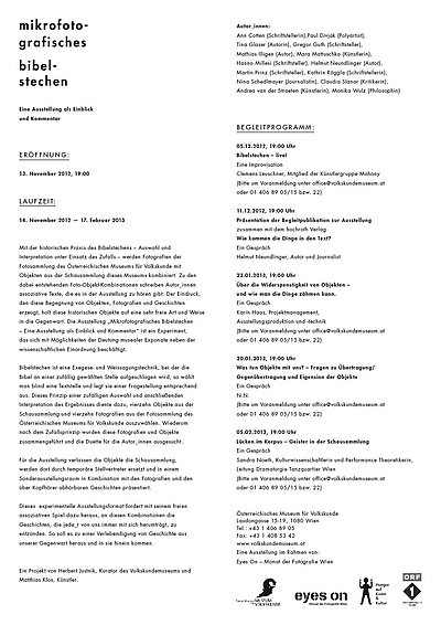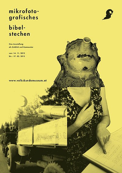 Die Praxis des Bibelstechens ist eine Exegese- und Weissagungstechnik, bei der die Bibel an einer zufällig gewählten Stelle aufgeschlagen wird; so wählt man blind eine Textstelle und legt diese einer Fragestellung entsprechend aus. Dieses Prinzip einer zufälligen Auswahl und anschließenden Interpretation des Ergebnisses wurde auf die Inventarbücher des Museums umgelegt. Es diente dazu, vierzehn Objekte aus der Schausammlung und vierzehn Fotografien aus der Fotosammlung des Österreichischen Museums für Volkskunde auszuwählen. Wiederum nach dem Zufallsprinzip wurden diese Fotografien und Objekte zusammengeführt. Zu den dadurch entstandenen Foto-Objekt-Kombinationen haben Autor_innen assoziative Geschichten geschrieben.