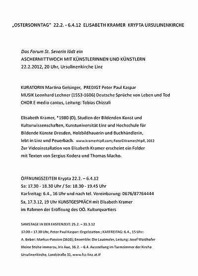 Eröffnung: 22.02.2012, 20.00 Uhr; Ausstellung bis 6. April 2012 Krypta der Ursulinenkirche, Landstraße 31, 4020 Linz