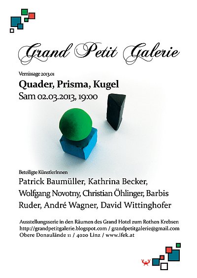 Für „Quader, Prisma, Kugel“ hat die Grand Petit Galerie KünstlerInnen eingeladen, Arbeiten vorzuschlagen, die diese Formen als Ausgangspunkt nehmen. Von den Einreichungen wurden sieben KünstlerInnen ausgewählt, die ab dem 2. März ihre Kunstwerke in den Schaufenstern der Grand Petit Galerie zeigen.