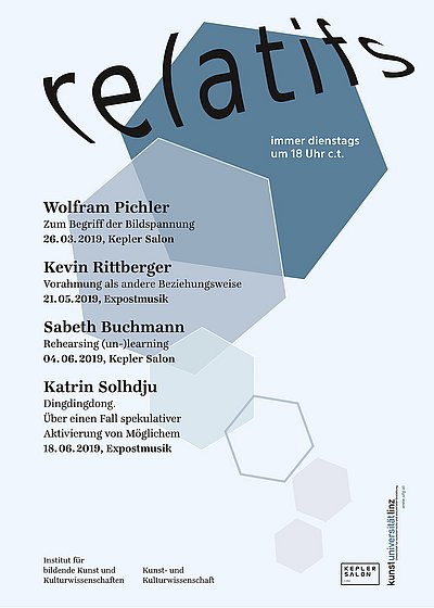 Im Kunstwort »relatifs« klingen Verhältnisse und Beziehungen an, aber auch Verwandte und Relais. Die Veranstaltungsreihe versteht sich so: als eine Schaltstelle zwischen verschiedenen kunst-, kultur- und medienwissenschaftlichen Ansätzen, als Vernetzungsstruktur zwischen Forschungen, die auf den ersten Blick disparat wirken, wie eine Familienfeier, anlässlich derer auf den Tisch kommt, was gerade unter den Nägeln brennt.