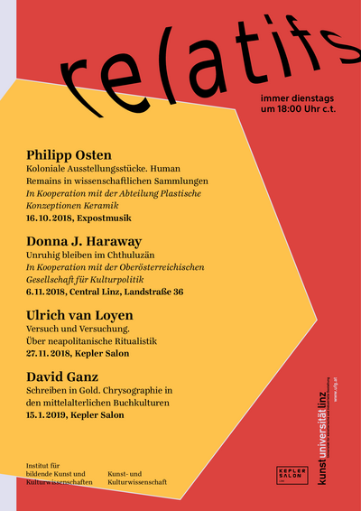 Die Veranstaltungsreihe relatifs wird von Karin Harrasser (Kunstuniversität Linz, Kulturwissenschaft), Anne von der Heiden (Kunstuniversität Linz, Kunstgeschichte und -theorie) und dem Kepler Salon Linz ausgerichtet.