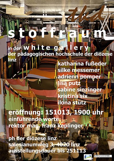 Die „stoffraum“ genannt Arbeit – entstanden an der Abteilung textil·kunst·design der Kunstuniversität linz - ist in der white gallery der Pädagogischen Hochschule der Diözese Linz ab 15.10. zu sehen. Abteilungsleiter Univ.Prof. Gilbert Bretterbauer und Studierende des Bachelorstudiums textil·kunst·design sowie des Lehramtstudiums Textiles Gestalten realisierten dieses Projekt innerhalb einer Kooperation mit der Anton Bruckner Privatuniversität. Die Arbeit besteht aus monochromen Stoffbahnen in 42 verschiedenen Farben, die in verschieden große Rechtecke zerschnitten und nach individuellen Kompositionen wieder zusammengenäht wurden. Für die Erstpräsentation, dem vorgegebenen architektonische Raum an der Kunstuniversität angepasst, sind nun die Maße für die white gallery adaptiert. die Arbeit ist eine in die bestehende Architektur eingefügte Membran. Große textile Flächen, an den Kanten mit Schlaufen versehen und mittels derer an Drahtseilen befestigt, bilden einen Raum im Rraum. Besucherinnen und Besucher des Stoffraums erfahren nicht nur akustisch eine gänzlich neue Wahrnehmung durch die sie umgebenden Textilflächen, sondern befinden sich gleichzeitig an einem neuen Ort.
