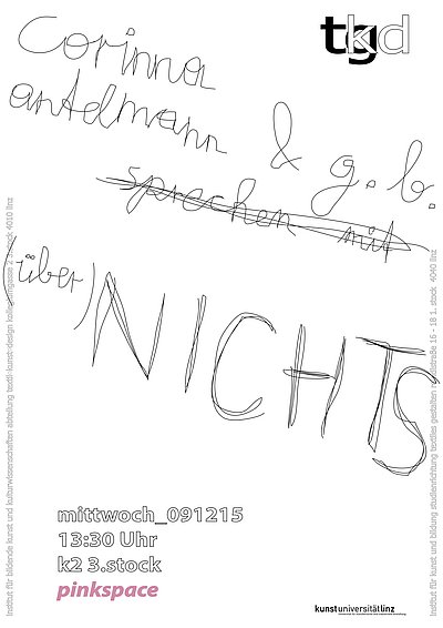 Studierende sind eingeladen Fragen zum Thema NICHTS vorzubereiten, die von der Schriftstellerin Corinna Antelmann und dem Künstler Gilbert Bretterbauer aufgegriffen und im Sinne einer Suche nach dem Ursprung von kreativen Tätigkeiten weiter zu verhandeln. Dabei wird versucht, sich nicht wie sonst üblich in Erklärungsmodellen künstlerischen Schaffens zu verlieren, sondern eine offene Kommunikation darüber zu führen, wie das NEUE in die Welt kommt. Ein Spiel zwischen Fragen, die nicht auf Antworten abzielen, ein Austausch von Gedanken zur Bewusstwerdung individueller Perspektiven. Corinna Antelmann wird einen Ausschnitt aus ihrer zuletzt erschienen Publikation lesen.
