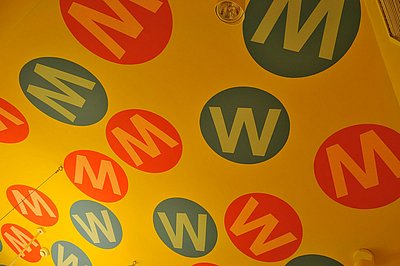 Christian Hutzinger’s W/W is an installation that combines painting and architecture. In a previously unused space, the artist has placed his trademark elements: a letter, a geometric figure, and colour. These play with the ‘inconvenient’ architecture of a basement niche, stressing its function as an ‘entrance/exit’ or ‘introduction’ to what awaits inside. The letter ‘W’, with its many meanings, is a sign that the artist plays with on every possible level.