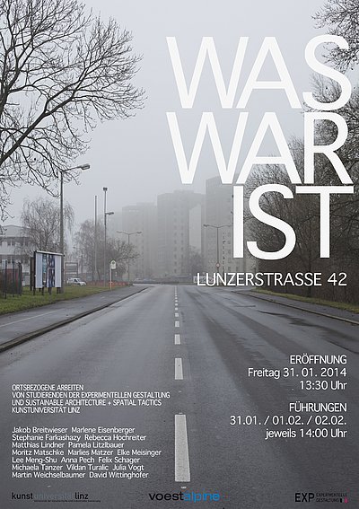 Die Lunzerstraße liegt im Linzer Süden auf dem Gelände der Voest Alpine zwischen Produktionsgebäuden auf der einen und dem direkt angrenzend Naturraum des unteren Traunlaufes auf der anderen Seite. Früher Überschwemmungsgebiet war hier gegen Ende des 2. Weltkrieges das Nebenlager III, ein Außenlager des KZ Mauthausen, in dem ZwangsarbeiterInnen der „Hermann Göring Werke“ in Holzbaracken untergebracht waren. 1972 wurden an dieser Stelle Lehrlings- und Arbeiterwohnungen in vier Hochhaustürmen mit jeweils 11 Stockwerken und Verbindungselementen im Parterrebereich errichtet. Ab Mitte der 1990er Jahre wurden diese als AsylwerberInnenheime genutzt, welche jedoch nach ca. 10 Jahren wegen fortschreitend unmenschlichen Bedingungen und ihrer isolierten Lage wieder aufgelöst werden mussten. 2013 standen die Gebäude großteils leer, nach aktueller Planung werden sie bis Mitte 2014 abgerissen um Lagerflächen für die Stahlproduktion der Voest Alpine zu erzeugen. Freundlicherweise bekam die Kunstuniversität Linz die Möglichkeit einen der Hochhaustürme kurz vor seinem Abbruch für ein halbes Jahr zu bearbeiten und zu bespielen.