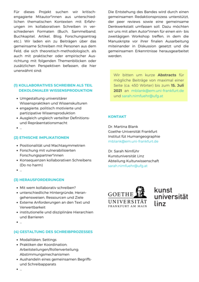 Im Fokus des geplanten Sammelbandes steht das kollaborative Schreiben mit Personen aus dem Feld. Ziel des Bandes ist, diese Form der Zusammenarbeit aus verschiedenen Blickwinkeln zu kontextualisieren und theoretische, konzeptionelle wie auch praxismethodologische Aspekte der Schreibzugänge, -verläufe und -beziehungen zu reflektieren. Der Band soll aus interdisziplinärer Perspektive Wissenschaftler*innen und ihren ForschungspartnerInnen einen vielfältigen Einblick in eine gemeinsame Schreibpraxis geben, die zu einer dekolonialen Wissensproduktion beiträgt.