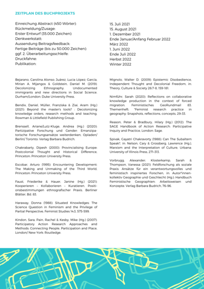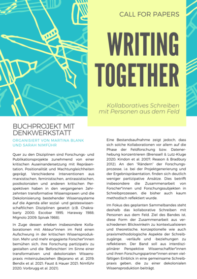 Für dieses Projekt suchen wir kritisch-engagierte MitautorInnen aus unterschiedlichen thematischen Kontexten mit Erfahrungen im kollaborativen Schreiben in verschiedenen Formaten (Buch, Sammelband, Buchkapitel, Artikel, Blog, Forschungsantrag etc.). Wir laden ein zu Beiträgen über das gemeinsame Schreiben mit Personen aus dem Feld, die sich theoretisch-methodologisch, als auch mit praktischer oder empirischer Ausrichtung mit folgenden Themenblöcken oder zusätzlichen Perspektiven befassen, die hier unerwähnt sind: