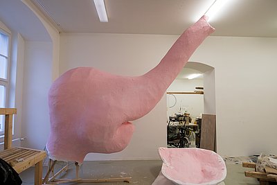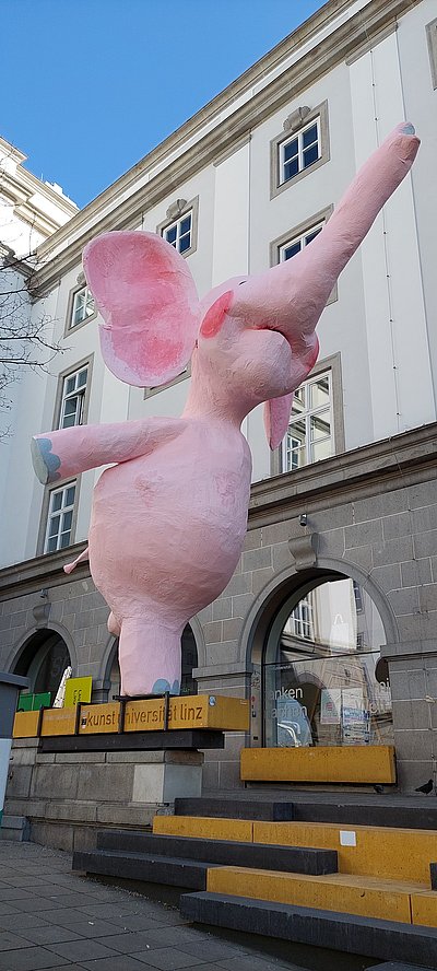 2020 hat es das Wort „Babyelefant“ in Österreich auf den ersten Platz zum Wort des Jahres geschafft. Ein Herdentier, das im engen Familienverband umsorgt und geschützt wird, diente nun als maßdienlicher Indikator für Abstand im sozialen Umfeld. Dies gab den Anstoß für eine einmalige Befreiungsaktion. Das Vorhaben entpuppte sich in kurzer Zeit als gigantische Herausforderung, so gigantisch, dass selbst die großen Hallen der Universität nicht genügend Platz boten. Aus diesem Grund musste der Warmblüter sein Dasein vorerst in mehreren Einzelteilen fristen. Glücklicherweise wurde nun ein passender Ort gefunden und so darf das Riesenbaby anlässlich des Tages der offenen Tür der Kunstuniversität, am Mittwoch, 23. März 2022 sein Nest verlassen und sich am Linzer Hauptplatz in seiner ganzen, acht Meter großen Pracht der Öffentlichkeit präsentieren. Neben seinem ohnehin unübersehbaren Volumen trägt nicht zuletzt seine Farbgebung zu der besonderen symbolischen Wirkung bei. Für gegenseitiges Verständnis, für Mitgefühl und Nächstenliebe, ganz besonders in dieser Zeit.