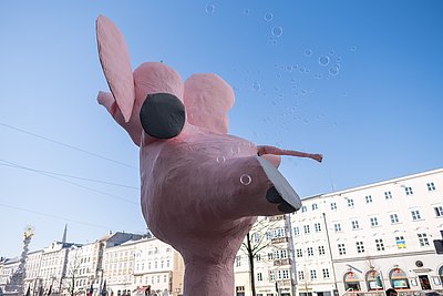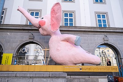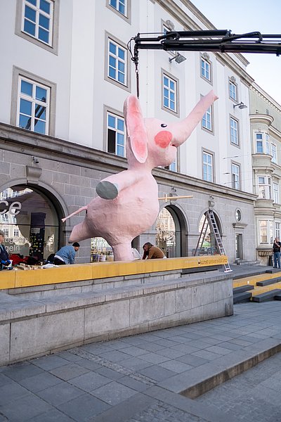 Derzeit balanciert das größte an Land lebende Säugetier unserer Zeit - ein rosa Babyelefant - am Hauptplatz vorm Brückenkopfgebäude.