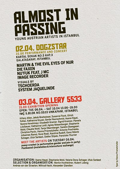 Die Präsentation junger österreichischer Kunst in der Galerie 5533 in Istanbul im April 2010 zeigt einen repräsentativen Querschnitt aktueller Produktionen. In Videos, Fotografien, Objekten, Performances und Audioinstallationen reflektieren die Künstlerinnen und Künstler persönliche Erfahrungen, aber auch die gesellschaftlichen und politischen Kontexte, in denen sie stattfinden.