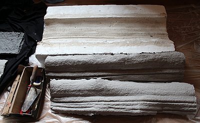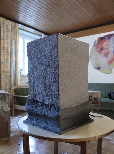 Unter dem Titel "Gfries" setzt sie der Fassade des Gebäudes, der "Schauseite" zur Straße hin, ihr eigenes Gesicht auf. Dazu formt die Künstlerin Objekte aus Pappmaché, die das Profil ihres Gesichtes zeigen, und bringt sie unter den Erdgeschoßfenstern an. Die Künstlerin knüpft damit an die historische Tradition der Fassadendekoration mit menschlichen Figuren oder Fratzen in Form von Skulpturen oder Reliefs an. Diese Figuren wurden mit einer bestimmten Bedeutung oder Funktion verbunden: der Darstellung von Macht, Repräsentation oder der Abwehr von bösen Geistern. Sie waren zumeist aus Stein und hatten über Jahrhunderte Bestand. Mit "Gfries", einer Anlehnung an das Dialektwort für Fratze oder Grimasse, geht Bernadette Laimbauer einen spannenden Dialog mit dieser Tradition ein. Ihre Fassadenelemente aus unversiegeltem Pappmaché sind Umwelteinflüssen ausgesetzt und verändern sich im Laufe der Zeit. Statt Figuren, die Macht repräsentieren oder symbolische Bedeutung haben, setzt sie der Erdgeschoßfassade ihr eigenes Gesicht vor. Form und Material gehen in dieser konzeptuellen Arbeit eine spannende Verbindung mit der Geschichte und Funktion der Fassadendekoration und dem Ort ein und hinterfragen als temporäre Intervention Rollenbilder im Stadtbild.